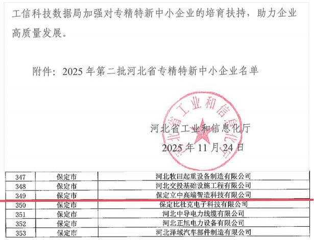 2025年11月24日,根據河北省工業和信息化廳印發的《關于公布2025年第二批河北省專精特新中小企業名單的通知》(冀工信企業函 〔2025〕542號),立中集團子公司保定立中高端智造科技有限公司憑借在技術創新、產品研發、市場競爭力等方面的突出表現,成功通過認定,躋身河北省專精特新中小企業行列。 “專精特新”中小企業是指具備專業化、精細化、特色化、創新型四大核心特征的優質企業,是產業鏈供應鏈的關鍵環節,也是推動經濟高質量發展的重要力量。此次成功入選,是對立中智造綜合實力和發展潛力的權威肯定。 未來,保定立中高端智造科技有限公司將以此次認定為契機,進一步強化創新驅動,聚焦主業、精耕細作,持續提升核心技術競爭力和市場影響力,在專業化、精細化、特色化、創新型發展道路上穩步前行。同時,公司將積極響應河北省關于優質中小企業梯度培育的政策導向,充分發揮專精特新企業的示范帶領作用,為區域經濟高質量發展貢獻更大力量。
